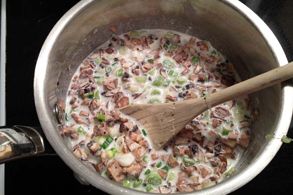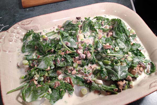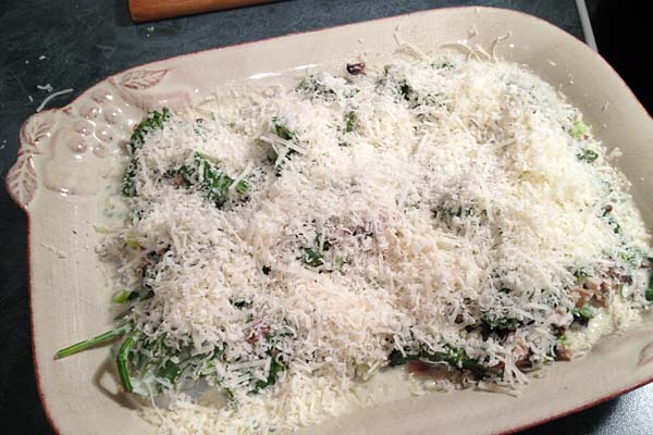 - In a medium saucepan over low heat, melt the butter and stir in the flour. Whisk in cream, milk, wine and 1/4 cup Parmesan cheese. Season with salt & pepper to taste. Add spinach, garlic, onions, and mushrooms and cook in sauce until softened, about 5 minutes.