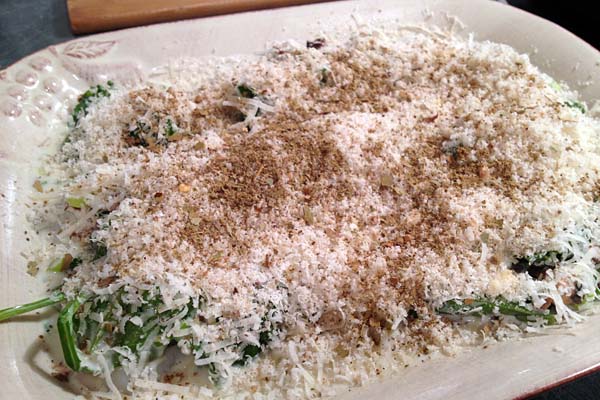 - Pour the cream sauce over the scallops. Top with 1/2 cup Parmesan and bread crumbs. Sprinkle Old Bay Seasoning over.