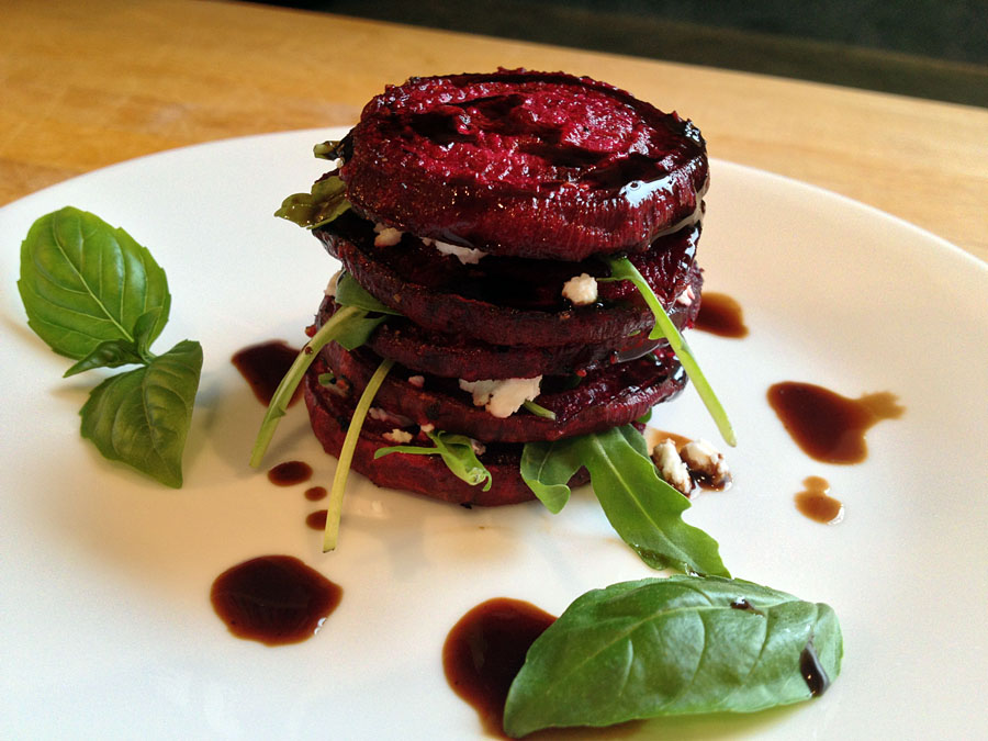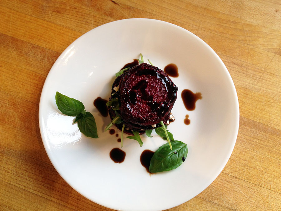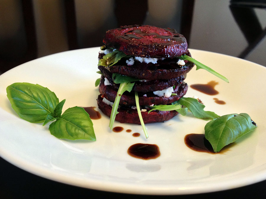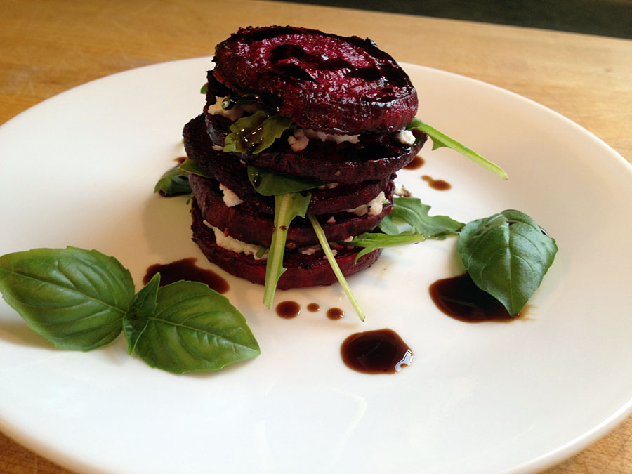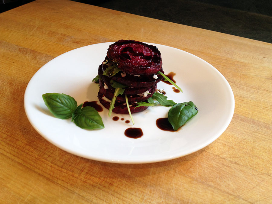 - To prepare salads: on a plate, place one cooled beet slice. Top with chèvre, a couple leaves of arugula, and a basil leaf. Repeat until you have reached desired height.