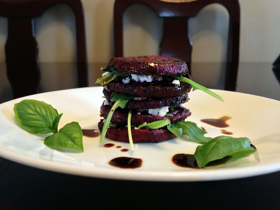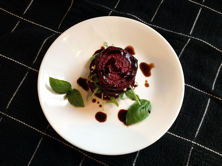 I’ve given some rough measurements for the ingredients, but there are a lot of variables: how big your beets are, how much you enjoy chèvre, basil, balsamic, etc. Feel free to wing it. And if the stacks are just too frustrating, this looks just as great in a “deconstructed” setting: spread the beets out on your plate, scatter arugula and basil over, top with chèvre and drizzle with balsamic. Equally beautiful (and delicious)!